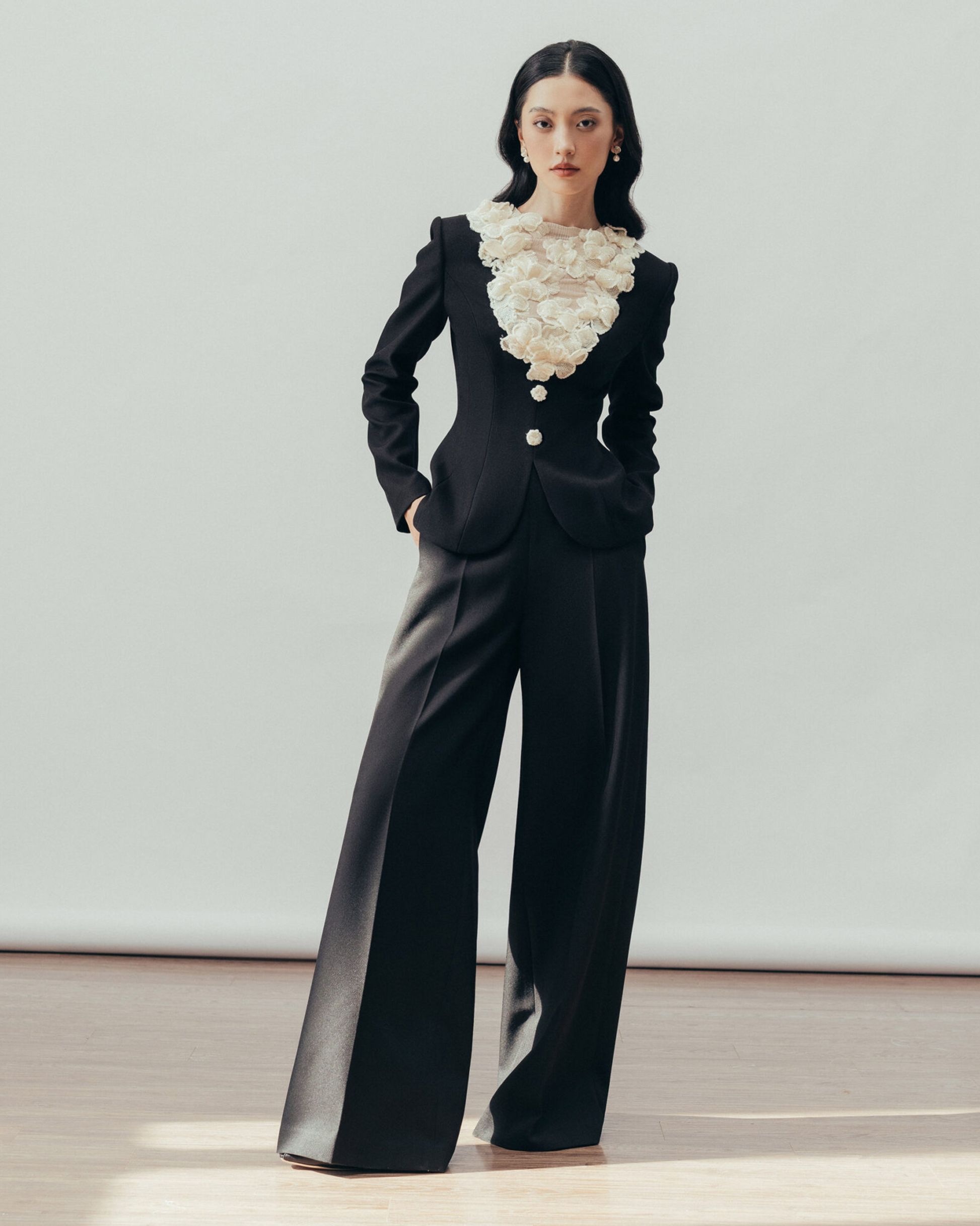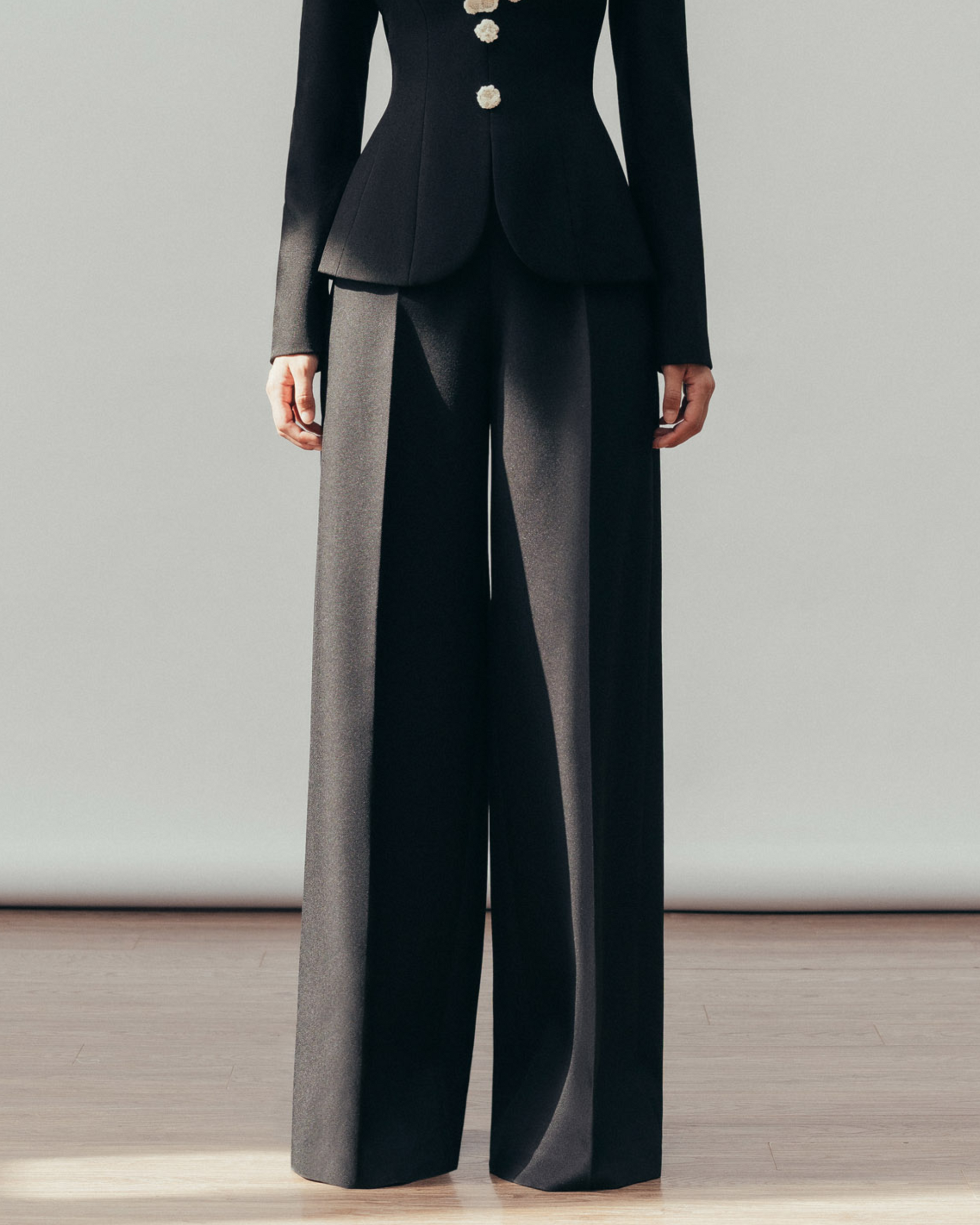 High-waisted, wide-leg pants with an asymmetric pleat.