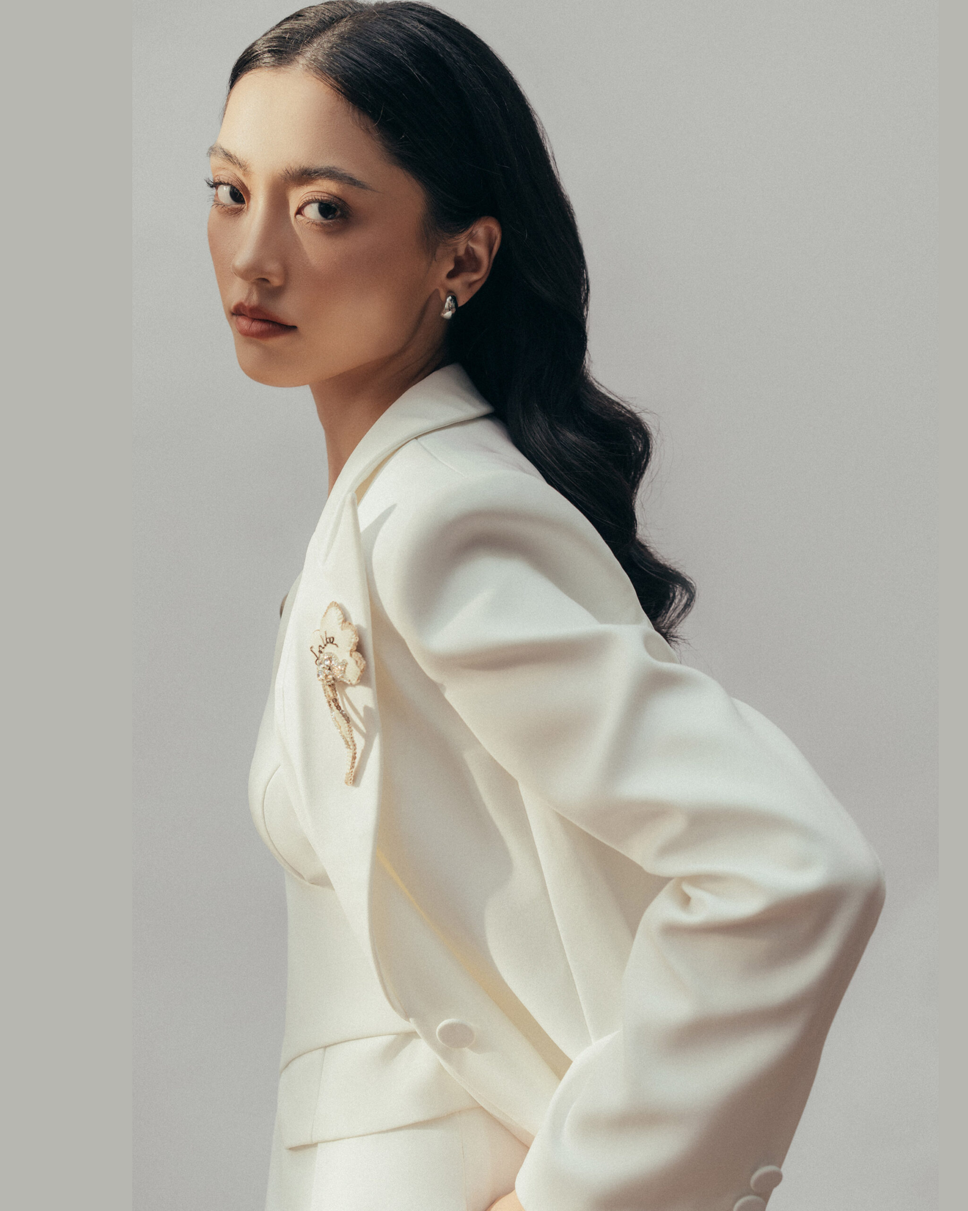 Relaxed-fit blazer with a modern touch and delicate charm embellishment.