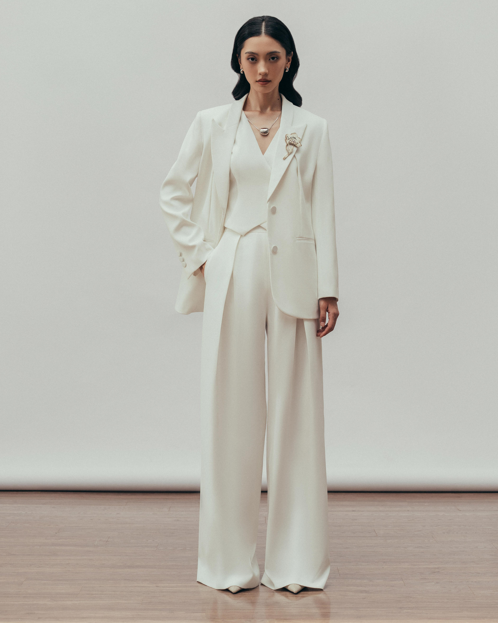 Versatile, high-waisted pants with an asymmetric pleat, perfect for pairing with various tops