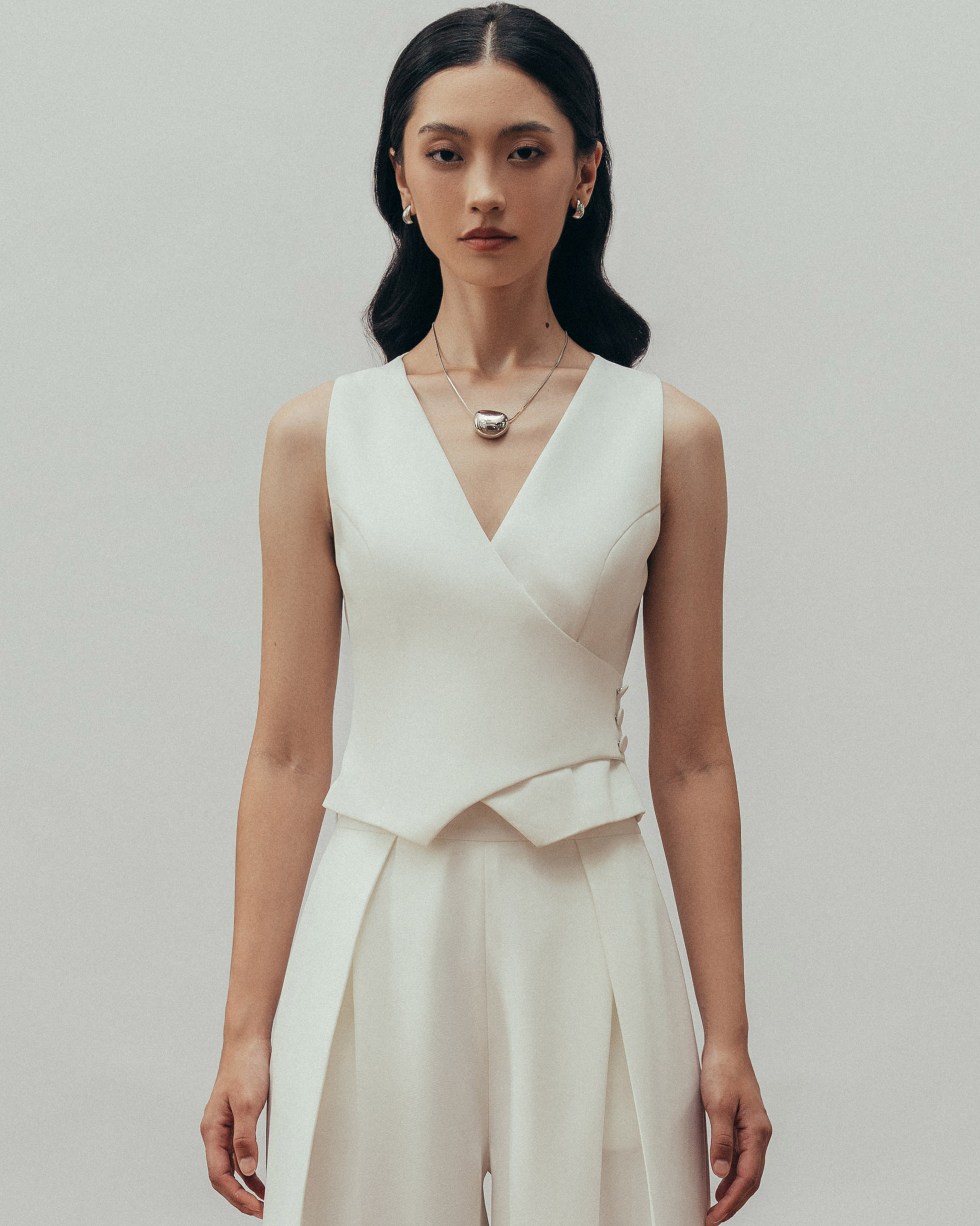 Versatile gilet with a V-neck and crossover lapel, perfect for pairing with various outfits
